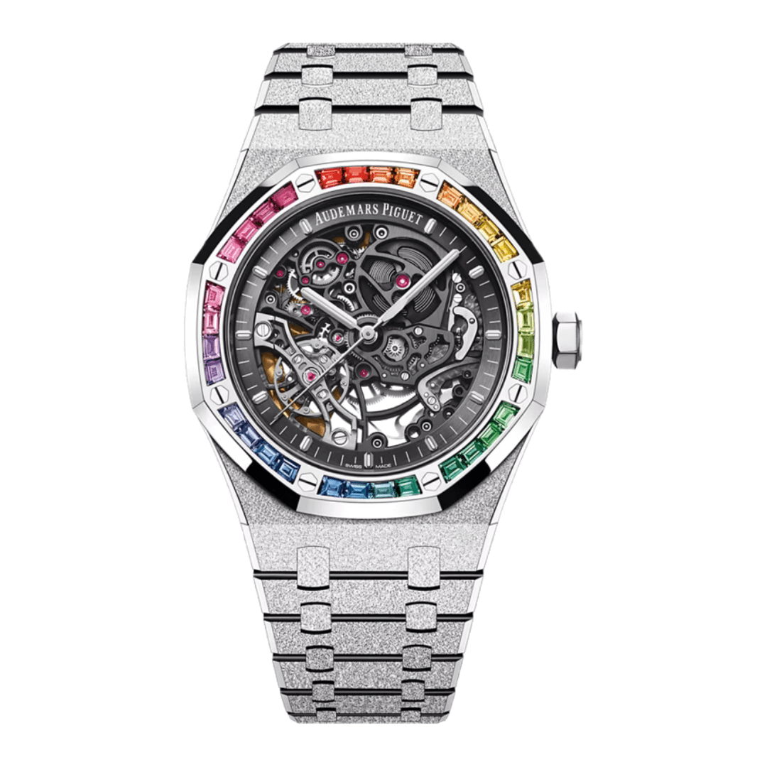 The AP Royal Oak Frosted Gold Double Balance Wheel Openworked Ref. 15412BC.YG.1224BC.03-B is a stunning combination of advanced watchmaking and elegant design. Crafted in frosted 18k white gold, the 41mm case and bracelet shimmer with a hand-hammered texture that enhances its luxurious appeal.
