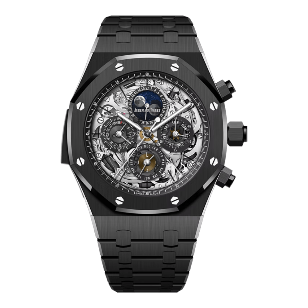 The AP Royal Oak Grande Complication Ref. 26605CE.OO.1248CE.01 is a prestigious model that showcases Audemars Piguet’s expertise in combining intricate horological complications with refined design. Crafted with a 44mm ceramic case, this watch stands out for its modern aesthetic and high-end features. The blue dial features the iconic Grande Tapisserie pattern and displays multiple complications, including a perpetual calendar, chronograph, and minute repeater, each meticulously integrated into the design.