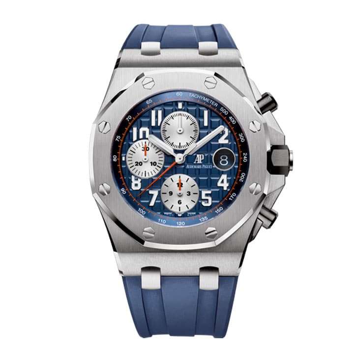 The Audemars Piguet Royal Oak Offshore Chronograph is a bold and modern reinterpretation of the classic Royal Oak. This luxury sports watch features a robust stainless steel case paired with a vibrant blue rubber strap for both style and durability. The blue dial, enhanced with a “Méga Tapisserie” pattern, showcases three silver sub-dials, red accents, and luminous hands, offering excellent legibility and a dynamic aesthetic.