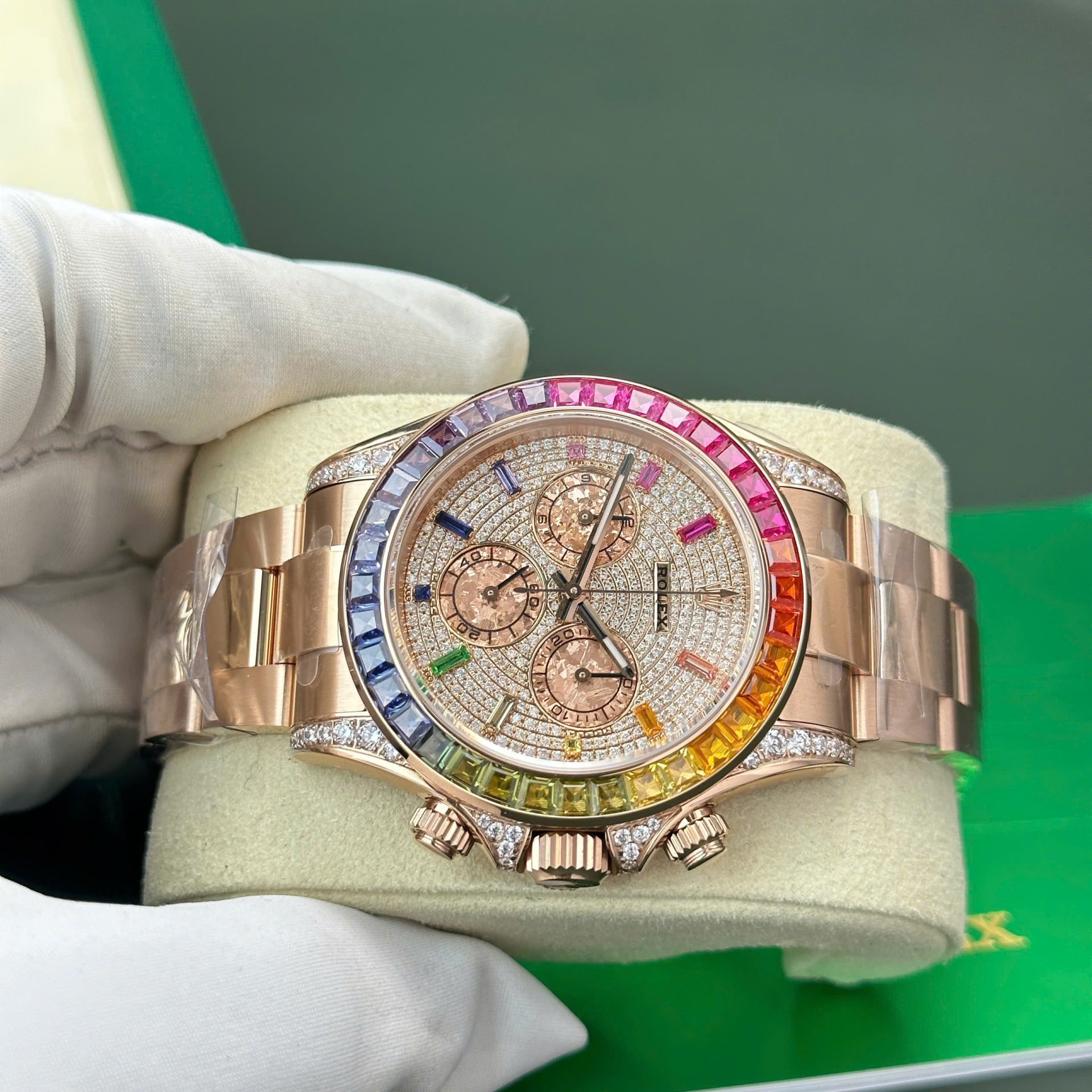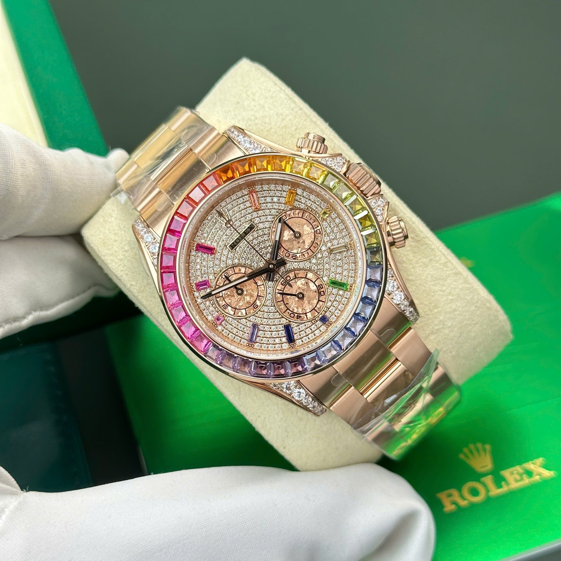 The Rolex Cosmograph Daytona 116595 Rainbow Replica from BT Factory is a stunning timepiece designed for those who appreciate luxury and style. This 40mm replica is crafted with meticulous attention to detail, featuring a rainbow-colored gemstone bezel that shines brilliantly, adding a touch of vibrant elegance to your wrist. The black dial is complemented by luminous hands and three sub-dials, making it easy to track time with precision.