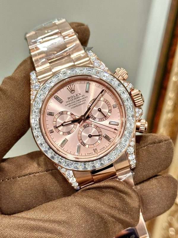 This Rolex Daytona 126595TBR replica is a luxury timepiece with a gold-plated body and custom Moissanite stones, crafted in Hong Kong. The 40mm case gives it a bold presence, while the shimmering Moissanite adds a rich, eye-catching shine across the bezel and dial.